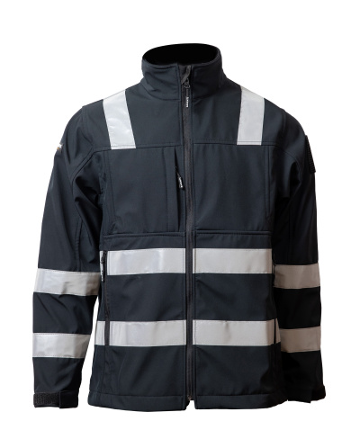 Куртка с удлинённой спинкой застёгивается на молнию. Воротник-стойка защищает шею от холода. Световозвращающие ленты шириной 5 см обеспечивает высокую видимость в тёмное время суток и в плохих погодных условиях.